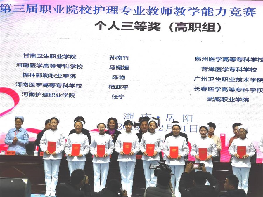 11月28日~12月1日,第三屆職業院校護理專業教師教學能力大賽在岳陽職業技術學院舉行,共有來自全國102所職業類院校的203位教師參賽。我校臨床護理學院副院長盧玉彬帶領2位青年教師參賽。經過激烈角逐,李莉萍獲個人二等獎、孫南竹獲個人三等獎,學校獲得團體二等獎。